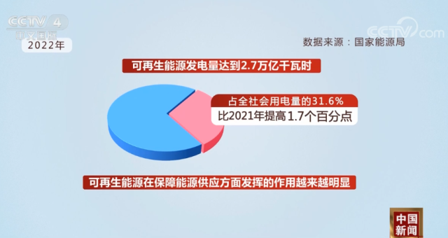 2022年,中國可再生能源呈現(xiàn)發(fā)展速度快、運行質量好、利用水平高、產(chǎn)業(yè)競爭力強的良好態(tài)勢,取得了諸多里程碑式的新成績。2022年,中國風電、光伏發(fā)電量達到1.19萬億千瓦時,比2021年增加2073億千瓦時,同比增長21%,接近全國城鄉(xiāng)居民生活用電量。2022年,可再生能源發(fā)電量達到2.7萬億千瓦時,占全社會用電量的31.6%,比2021年提高1.7個百分點,可再生能源在保障能源供應方面發(fā)揮的作用越來越明顯,可再生能源新增裝機已成為中國電力新增裝機的主體。