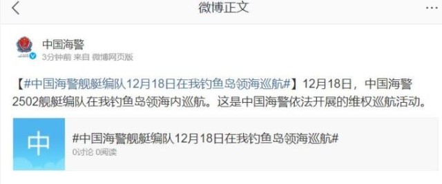 中新網(wǎng)12月18日電 據(jù)中國海警官方微博消息,12月18日,中國海警2502艦艇編隊(duì)在我釣魚島領(lǐng)海內(nèi)巡航。這是中國海警依法開展的維權(quán)巡航活動(dòng)。