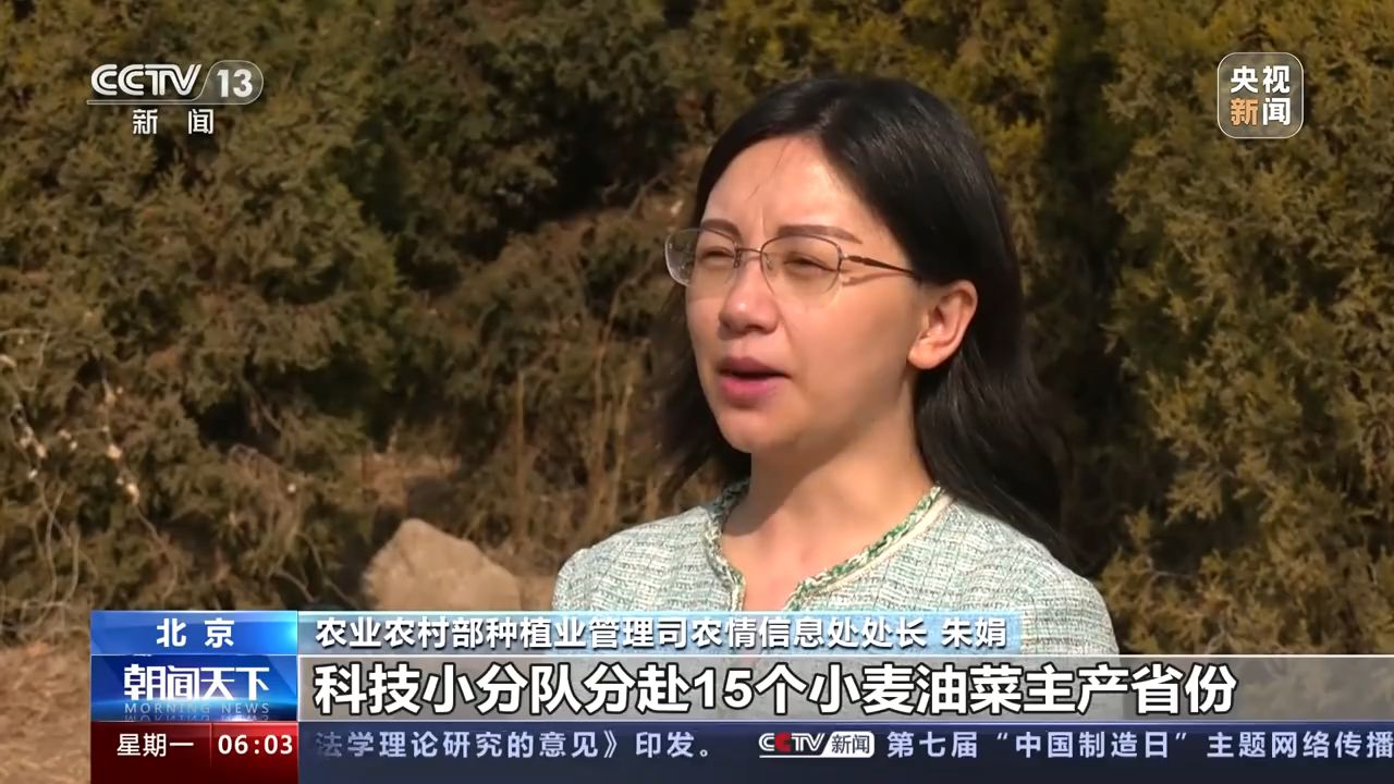 農(nóng)業(yè)農(nóng)村部種植業(yè)管理司農(nóng)情信息處處長 朱娟:科技小分隊(duì)分赴15個小麥油菜主產(chǎn)省份,包片蹲點(diǎn),指導(dǎo)落實(shí)以“控旺促弱、抗旱防凍、防病治蟲”為重點(diǎn)的春季田管關(guān)鍵措施,全力以赴打贏夏糧豐收第一仗。(央視新聞客戶端)