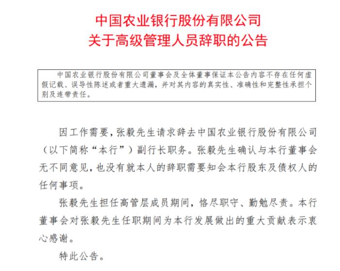 中國(guó)農(nóng)業(yè)銀行也人事變動(dòng)不斷。21日,農(nóng)行公告稱,因工作需要,張毅請(qǐng)求辭去中國(guó)農(nóng)業(yè)銀行副行長(zhǎng)職務(wù)。