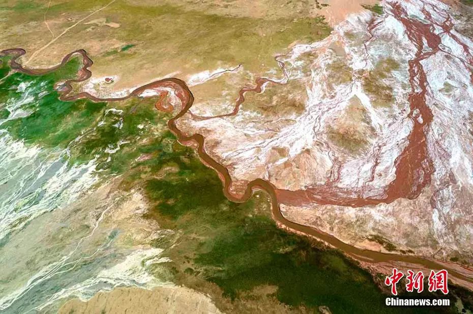 阿拉克湖多條支流奔流不息地拍打著紅色河床,猶如碧玉寶鏡舞動(dòng)著紅色絲帶。柴迪成 攝