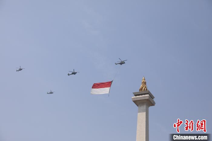 8月17日,雅加達(dá)獨(dú)立廣場上空,直升機(jī)拉起巨幅印尼國旗。中新社記者 李志全 攝