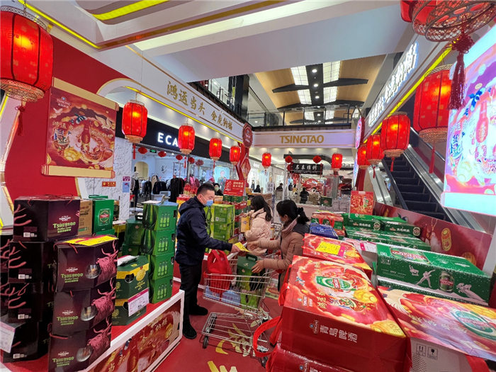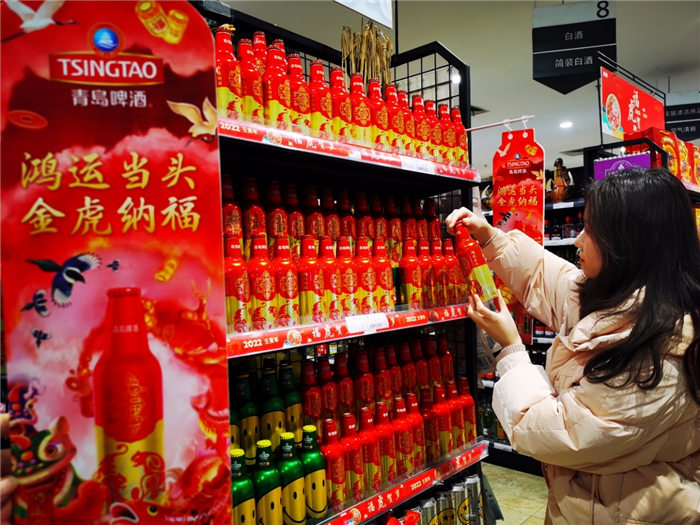 年味不僅是物質(zhì)上的豐富,也有文化上的追求?!斑^年就買‘鴻運當頭’,圖個好彩頭?!毕M者王先生每年過年都會“鴻運當頭,先囤一波”,作為年夜飯的“必選項”?!澳暌癸埍仨毤t紅火火,不管是名字還是包裝,鴻運當頭就是喜慶,而且酒也好喝,每年還出不同的生肖版,我都收藏著著呢?!痹S多消費者表示,這款青島啤酒成為春節(jié)當之無愧的“鴻運”年貨,走親訪友拎上一提,年味就出來了。