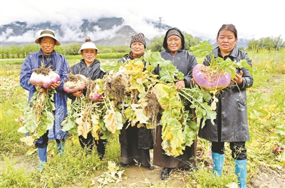 中國科學(xué)院創(chuàng)新研發(fā)的蕪菁種植技術(shù)為促進當(dāng)?shù)剞r(nóng)業(yè)生產(chǎn)與畜牧業(yè)的發(fā)展提供了技術(shù)支撐。圖為拉薩市曲水縣才納鄉(xiāng)村民抱著蕪菁新品種。