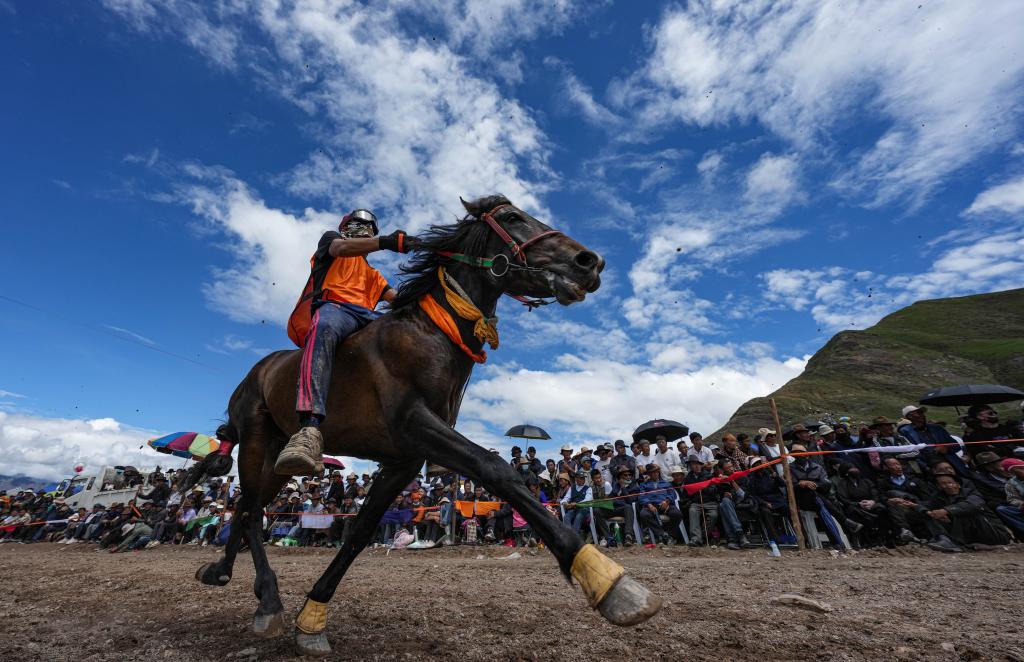 23日,在拉薩林周縣甘旦曲果鎮(zhèn)江角村的賽馬場上,選手邊瑪益丹穿著輕便的馬術(shù)運(yùn)動(dòng)服,上身貼緊棕色馬背,右手的馬鞭在空中打著旋,和他的愛馬進(jìn)行最后沖刺。