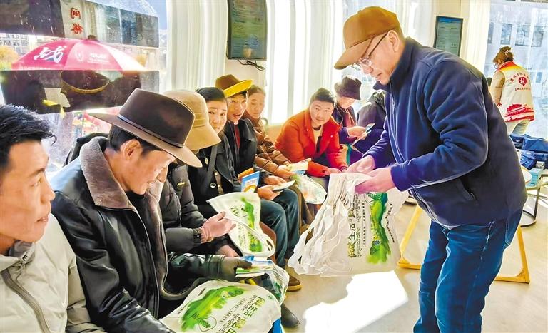 圖為工布江達(dá)縣社區(qū)工作人員向群眾發(fā)放宣傳品。 文/圖 記者 劉楓 謝筱純