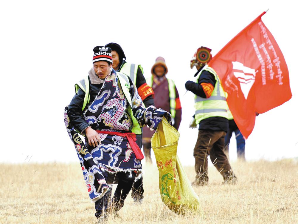 三江源國(guó)家公園黃河源園區(qū)扎陵湖鄉(xiāng)生態(tài)保護(hù)站勒那村生態(tài)管護(hù)隊(duì)隊(duì)員在鄂陵湖畔撿拾垃圾。