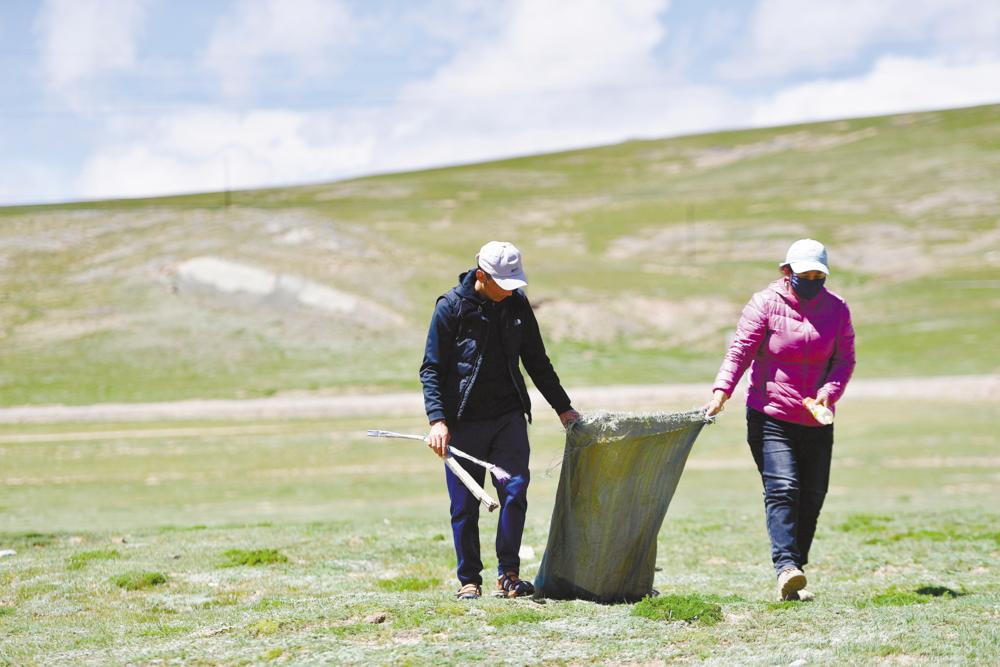 瑪多縣瑪查理鎮(zhèn)噶丹村,生態(tài)管護(hù)員索南吉(右)與才讓多杰在村子周邊的草原上撿垃圾。