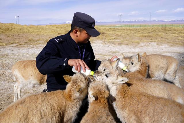 可可西里巡山隊員鄧海平給藏羚羊幼仔喂奶。新華社記 者王金金 攝