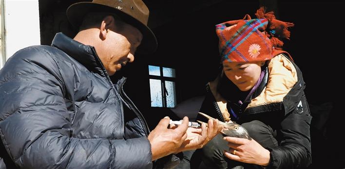 “你看,這只黑頸鶴是十幾天前我從田間救回來(lái)的,當(dāng)時(shí)它的翅膀和右腿都受了傷,奄奄一息,我還擔(dān)心救不活它。我把消炎藥放入酥油中攪拌制成膏藥,涂抹在它的傷口上,并給它喂了口服消炎藥,白天就把它放到院子里,讓它鍛煉受傷的腿腳。通過(guò)細(xì)心照料它恢復(fù)得很好,等它痊愈了,我就把它放歸大自然?!?9歲的巡護(hù)員多布杰高興地說(shuō)。