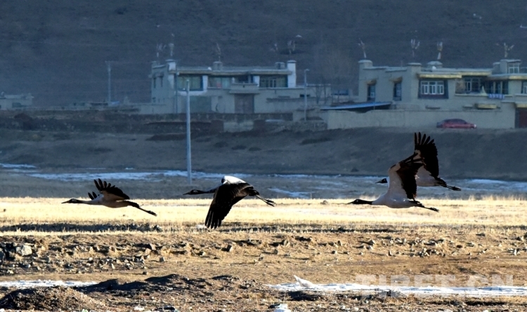 圖為黑頸鶴在林周縣境內(nèi)飛翔 攝影:王媛媛
