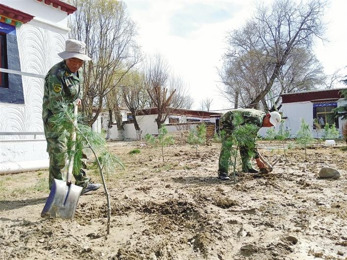 羅布林卡管理處園林科工作人員進行苗木補栽。記者 央金卓瑪 攝