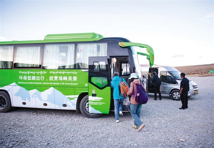 游客在珠穆朗瑪峰景區(qū)停車場轉(zhuǎn)乘環(huán)??蛙嚕?019年5月16日攝)。珠穆朗瑪峰景區(qū)內(nèi)自2019年5月開始試運(yùn)營清潔能源環(huán)??蛙?,以進(jìn)一步平衡珠峰地區(qū)旅游發(fā)展與環(huán)境保護(hù)需要。新華社記者 孫非 攝