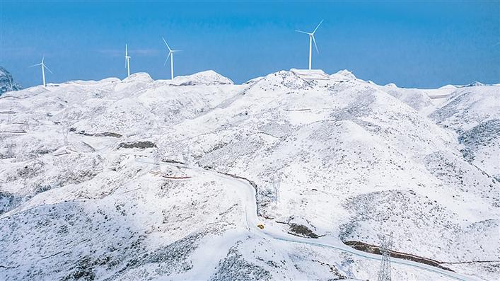 雪后的貴州盤縣四格風(fēng)電場(2021年1月12日攝,無人機(jī)照片)。 新華社記者 陶亮 攝