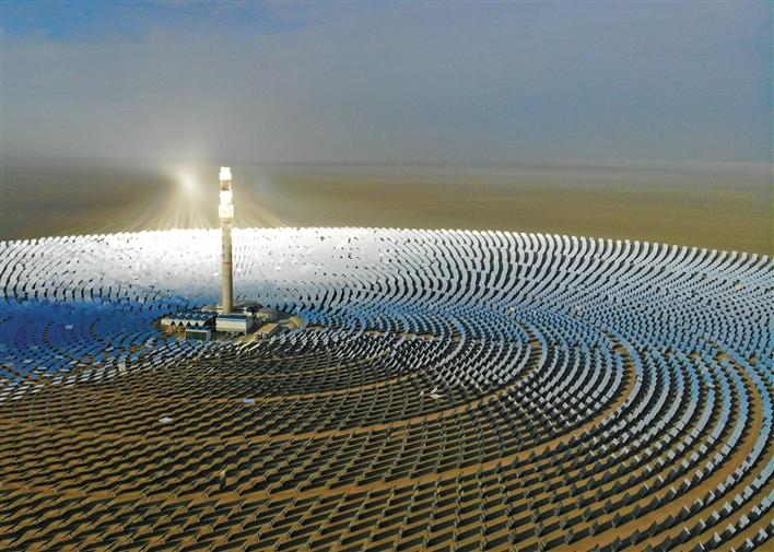 在甘肅省敦煌市向西約20公里處,被稱為“超級(jí)鏡子發(fā)電站”的首航高科敦煌100兆瓦熔鹽塔式光熱電站在戈壁灘上閃耀(2021年2月24日攝,無人機(jī)照片)。新華社記者 馬希平 攝