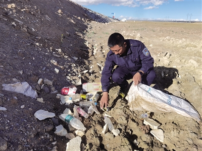 可可西里索南達(dá)杰保護(hù)站工作人員在109國(guó)道沿線撿拾被丟棄的垃圾??煽晌骼锕芾硖幑﹫D