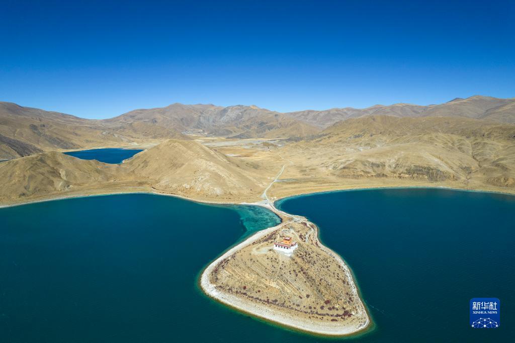 這是11月16日拍攝的羊卓雍措和坐落在湖畔的日托寺(無人機(jī)照片)。新華社記者 孫瑞博 攝