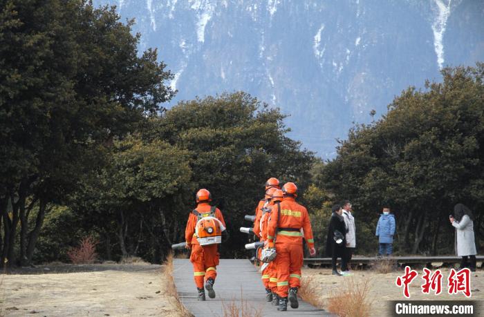 圖為森林消防員在景區(qū)重點區(qū)域普及防火知識?!×种ナ猩窒拦﹫D