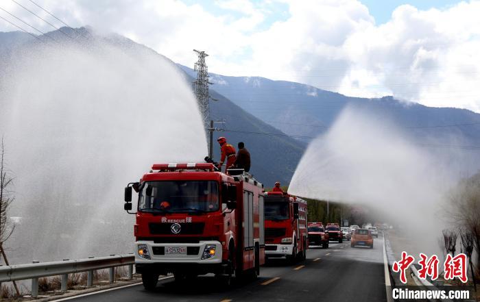 林芝市森林消防支隊(duì)消防員正在進(jìn)行灑水增濕作業(yè)?!∥骼@拉翁 攝