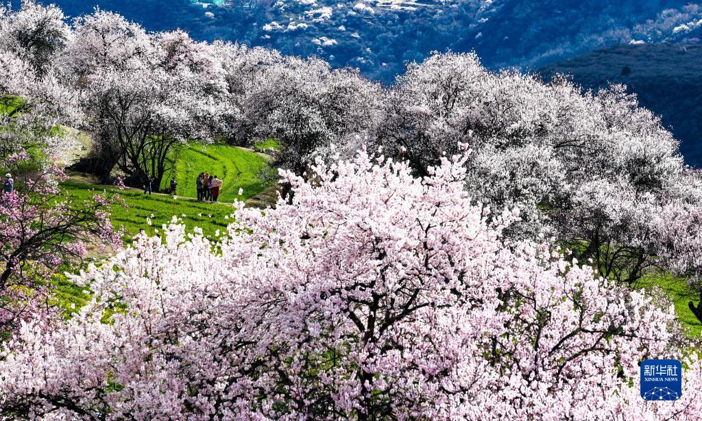 游客在林芝市索松村的桃花林間游玩(4月5日攝)。新華社記者姜帆攝