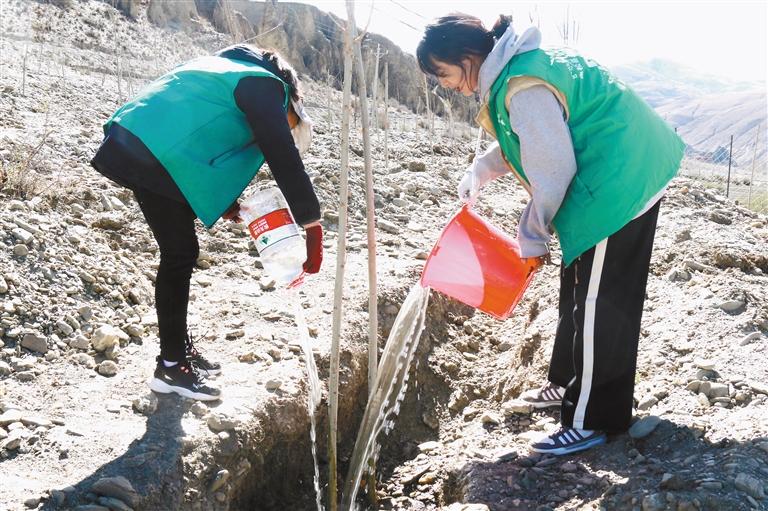 志愿者在為樹苗澆水