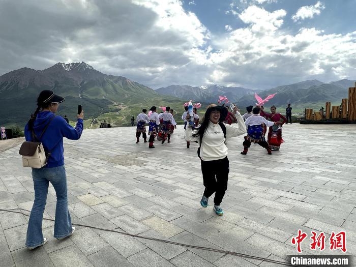 圖為游客與祁連民眾一起跳舞?!±铍h 攝