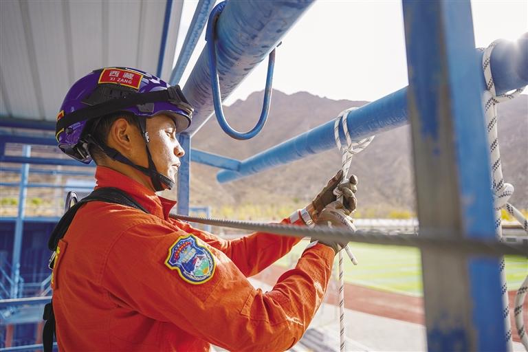 迅速打好繩結(jié)、扣好安全帶……27歲的仁增論珠身著全套戰(zhàn)訓服,正在進行繩索下降訓練。身姿矯健、動作干凈利落,眨眼間,他已安全降至地面。仁增論珠從小就有個當兵夢,2015年,他應(yīng)征入伍,三年部隊生活錘煉了他的體能和意志。2019年,仁增論珠入職自治區(qū)森林消防總隊,成為一名消防戰(zhàn)士,繼續(xù)為保家衛(wèi)國貢獻自己的力量。