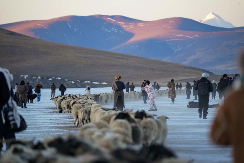 年復(fù)一年,驚艷又震撼的“冰上趕羊”盛宴,在普莫雍措已上演了千年。這一獨特的自然人文景觀構(gòu)成了冬日里絕美的風(fēng)景,也吸引著眾多游客前來打卡。