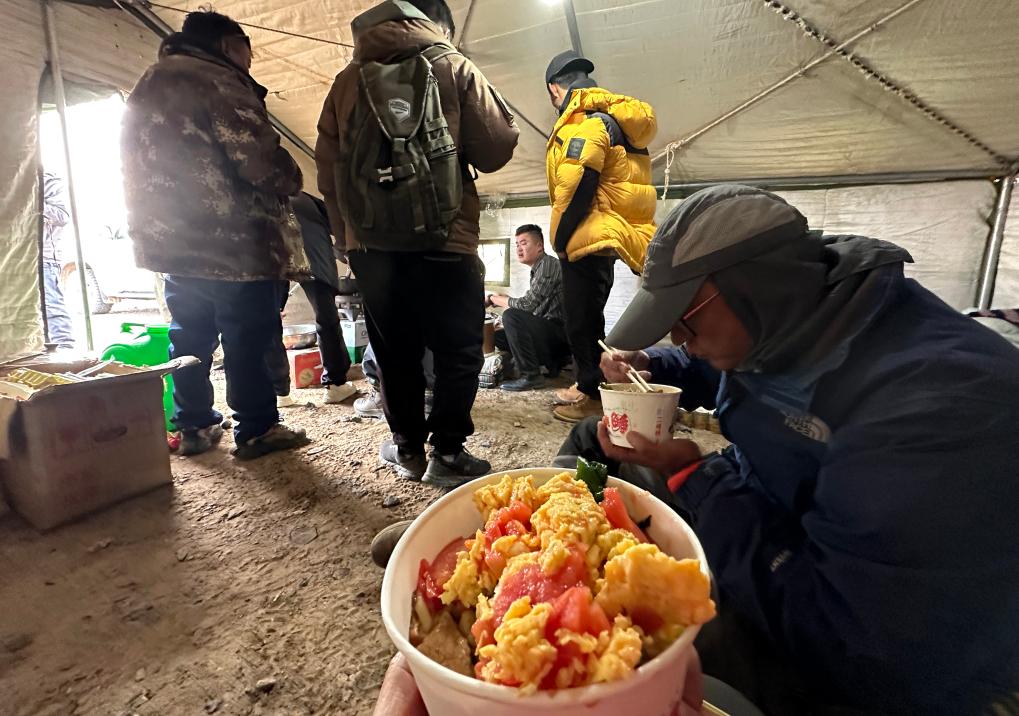 6月13日,記者在享用帳篷里的晚餐。新華社記者 費(fèi)茂華 攝