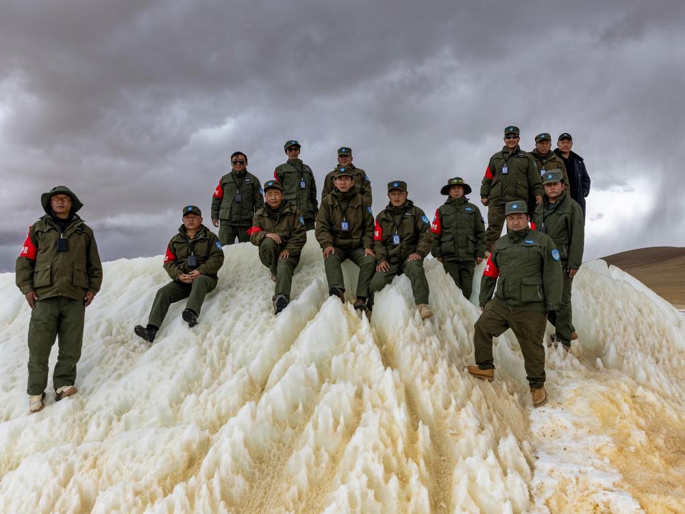 2024年5月7日,在西藏羌塘國(guó)家級(jí)自然保護(hù)區(qū),野生動(dòng)物專業(yè)管護(hù)隊(duì)員在巡護(hù)路上一處埡口的冰雪堆上合影。