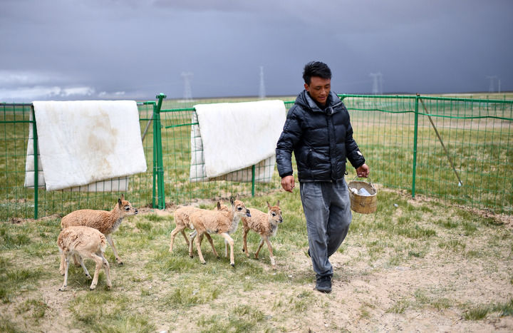 在索南達(dá)杰保護(hù)站,可可西里巡山隊(duì)隊(duì)員在給被救助的藏羚羊幼仔喂奶(2023年7月28日攝)。新華社記者 張宏祥 攝