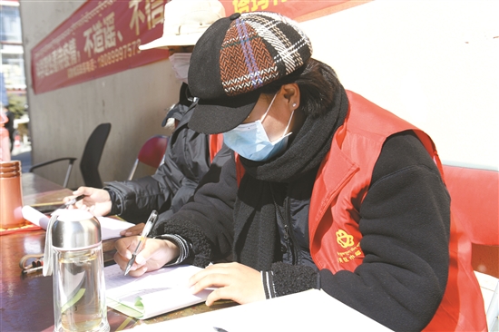 為大學(xué)生志愿者次仁措姆在塔瑪小區(qū)門(mén)口幫小區(qū)物業(yè)登記出入人員信息。(本組圖片由拉薩融媒視覺(jué)組攝)