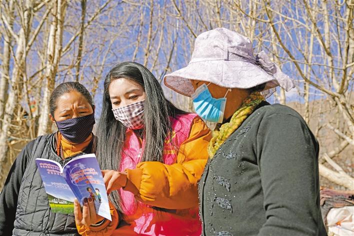 圖為近日,西藏山南市瓊結縣“四講四愛”群眾教育實踐活動辦工作人員為村民宣講疫情防控知識及“講文明愛生活”內容。 記者 耿銳仙 攝