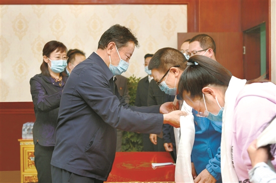 9月10日上午,區(qū)黨委常委、拉薩市委書(shū)記白瑪旺堆看望慰問(wèn)離退休和辛勤工作在教育一線的教師代表,并通過(guò)他們向全市廣大教師和教育工作者致以節(jié)日的祝賀和誠(chéng)摯的問(wèn)候。圖為在拉薩市北京中學(xué),白瑪旺堆為教師代表一一獻(xiàn)上哈達(dá)。 拉薩融媒記者 平措旺堆攝