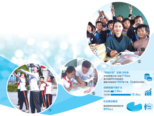 農(nóng)村義務(wù)教育階段學(xué)校教師特設(shè)崗位計(jì)劃(簡稱“特崗計(jì)劃”)始于2006年,每年公開招考選聘數(shù)萬名高校畢業(yè)生到中西部貧困縣農(nóng)村學(xué)校任教。