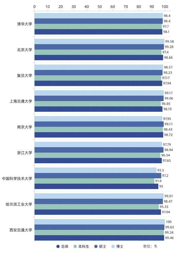其中,最高的是西安交通大學,畢業(yè)生就業(yè)率達99.46%;最低的是中國科學技術(shù)大學,畢業(yè)生就業(yè)率為95%。