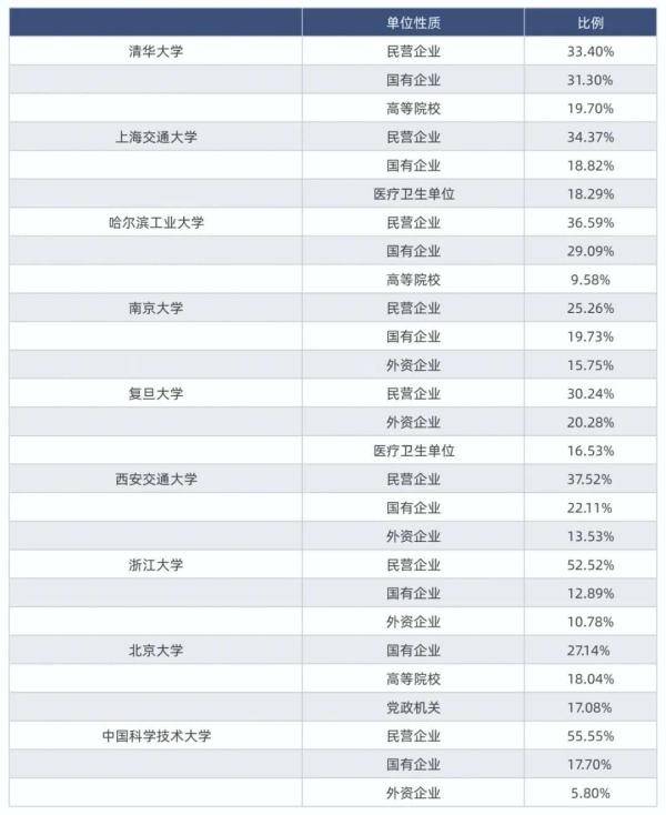 其中,清華大學的畢業(yè)生更偏向于選擇國有企業(yè),占比31.3%,排名第一;北京大學則以27.14%的占比排名第三。