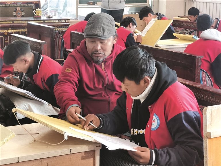 圖為唐卡車間的老師正在指導(dǎo)學(xué)生唐卡繪制的起稿和線描技藝。凃瓊 攝