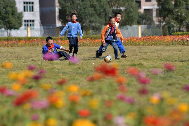 寨下鎮(zhèn)中心小學(xué)的學(xué)生們?cè)诨ㄌ镩g的草地上踢足球(11月9日攝)。