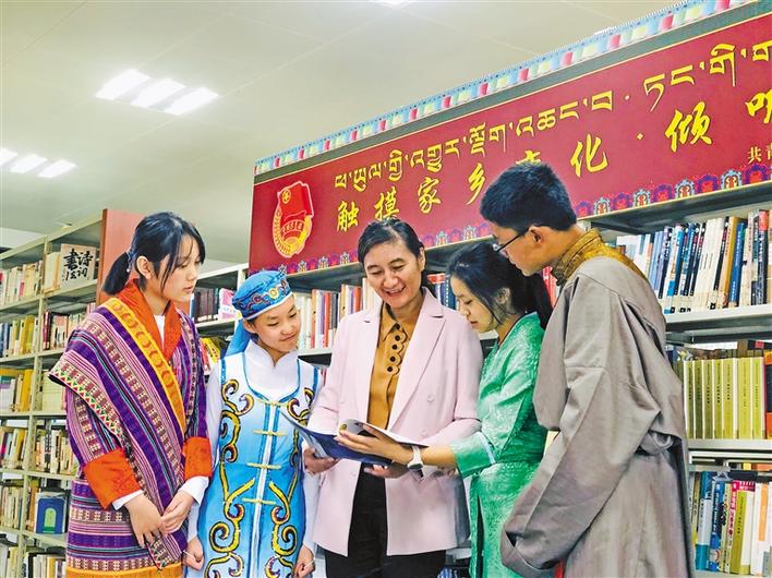 共青團西藏自治區(qū)委員會副書記格桑卓瑪(中),在武漢西藏中學設立的“觸摸家鄉(xiāng)變化·傾聽黨的聲音”主題書刊欄處向?qū)W生們介紹相關(guān)書籍。