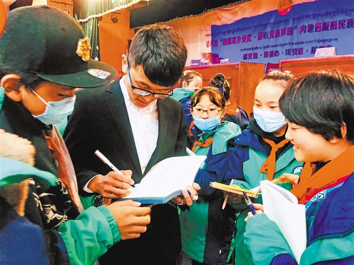 宣講活動過程中,共青團西藏自治區(qū)委員會副書記格桑卓瑪、西藏青年報社副社長洛桑頓珠給6所學校內(nèi)地西藏班的學生們贈送了《西藏青年報》《西藏青年》等刊物和書籍。格桑卓瑪語重心長地囑咐孩子們:“作為新時代的新青年,要時刻牢記時代賦予的新使命,要用新時代的標尺審視自己,用科學文化武裝自己,淡化宗教消極影響,在新征程的熔爐中鍛造自己,努力使自己成為堪當民族復興大任的新青年,在全面建設社會主義現(xiàn)代化國家新征程中貢獻自己的青春力量,做神圣國土的守護者、幸福家園的建設者,在青春的閃光中踐行‘感黨恩、愛核心、聽黨話、跟黨走’的家國情懷?!?/p>