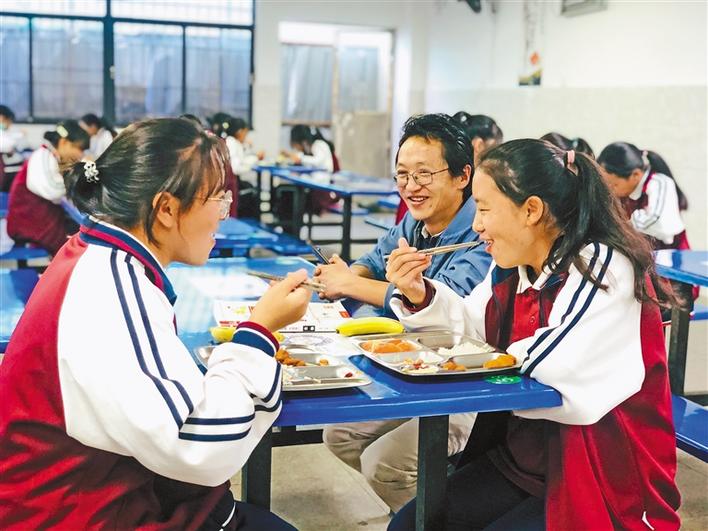 西藏青年報社副社長洛桑頓珠(右二)在珠海四中學校食堂與內(nèi)地西藏班學生進行交談。