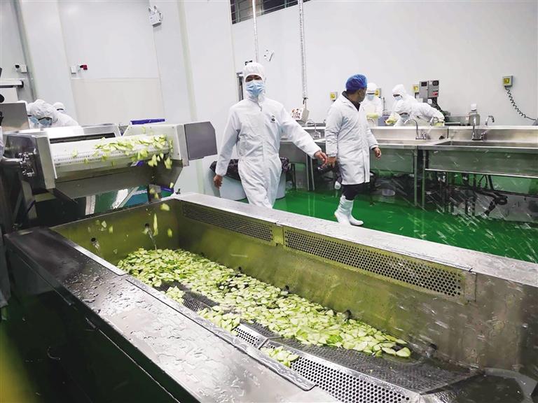 隨后,記者來到了素菜初加工車間,這里有很多設備,洗凈的一筐青筍條通過其中一個小設備后,兩分鐘全部變成了青筍丁,洗凈的菜瓜通過一條切片的生產線后立即變成了小的塊狀,經過保食安專業(yè)食品凈化工業(yè)機后,直接回收到盛菜的框里。在葷菜初加工車間,工作人員把雞蛋放入水池中消毒清洗,將洗凈的雞脯肉放入切丁機中進行分切,一兩分鐘雞脯肉就變成了肉丁。