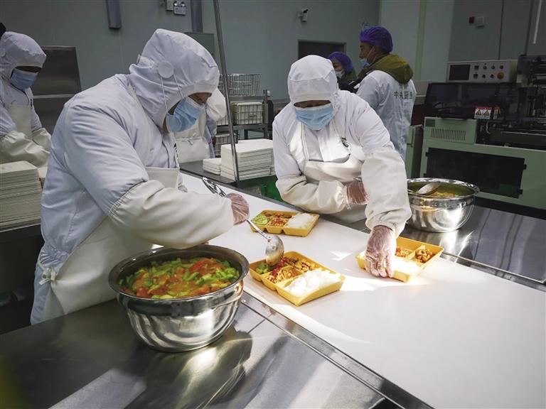 這些凈菜準備好后,通過設備轉運至熱菜烹炒車間,在這里有幾位廚師正在烹飪宮保雞丁、西紅柿炒蛋、青菜西紅柿湯等。這些凈菜經過加工之后被運送至分餐車間。餐盒經高溫消毒后,工作人員將每一份米飯、熱菜取樣留存,然后開始分工分餐,打包好的餐盒通過加溫消毒后,裝進保溫箱,運送至配餐車內。