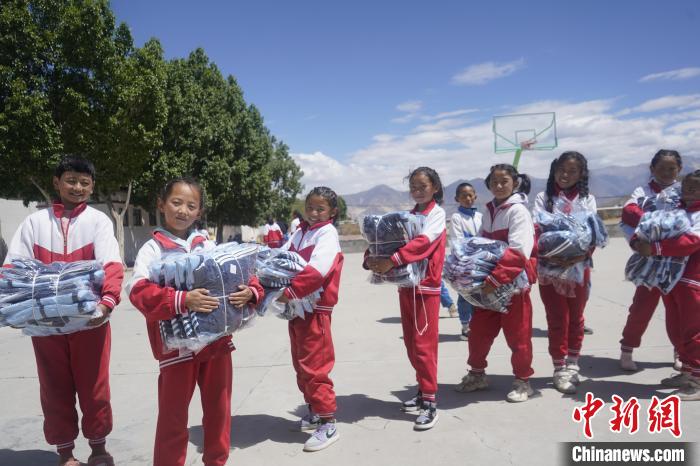 圖為拉薩市空港新區(qū)甲日小學學生們拿到新校服合影?!∝暩聛硭?攝