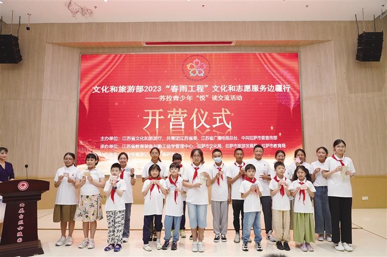 儀式上,江蘇和拉薩兩地青少年圍繞“中華民族一家親,同心共筑中國夢(mèng)”主題開展了互助結(jié)對(duì)儀式和“春雨工程”授旗儀式,范躍平和陳兵共同將文旅部“春雨工程”項(xiàng)目旗幟授給本次活動(dòng)項(xiàng)目領(lǐng)隊(duì)、拉薩市圖書館館長朱純琳。