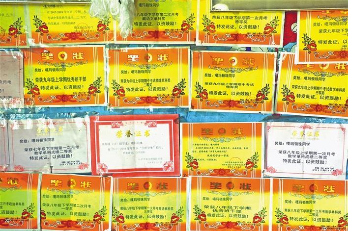 那嘎村脫貧戶扎西多吉家的獎狀墻。