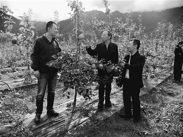 國家蘋果產(chǎn)業(yè)技術(shù)體系首席科學(xué)家霍學(xué)喜(中)在米林縣羌納蘋果示范基地現(xiàn)場開展技術(shù)指導(dǎo)。西藏日報記者 李梅英 攝
