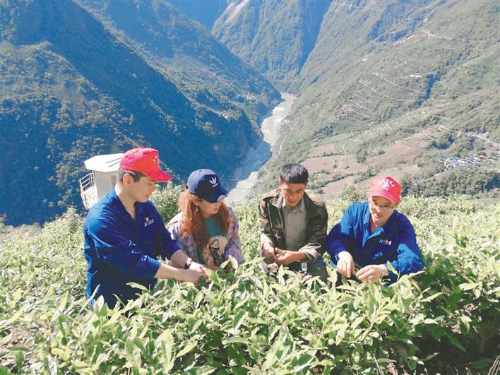 圖為華能雅江公司駐村干部與當?shù)匕傩找黄鸩榭床枞~長勢。記者 楊小娟 攝