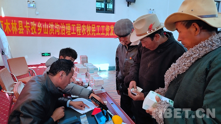 圖為西藏自治區(qū)日喀則市南木林縣卡孜鄉(xiāng)山洪溝治理工程項目民工工資發(fā)放暨勞務合作社分紅儀式現(xiàn)場